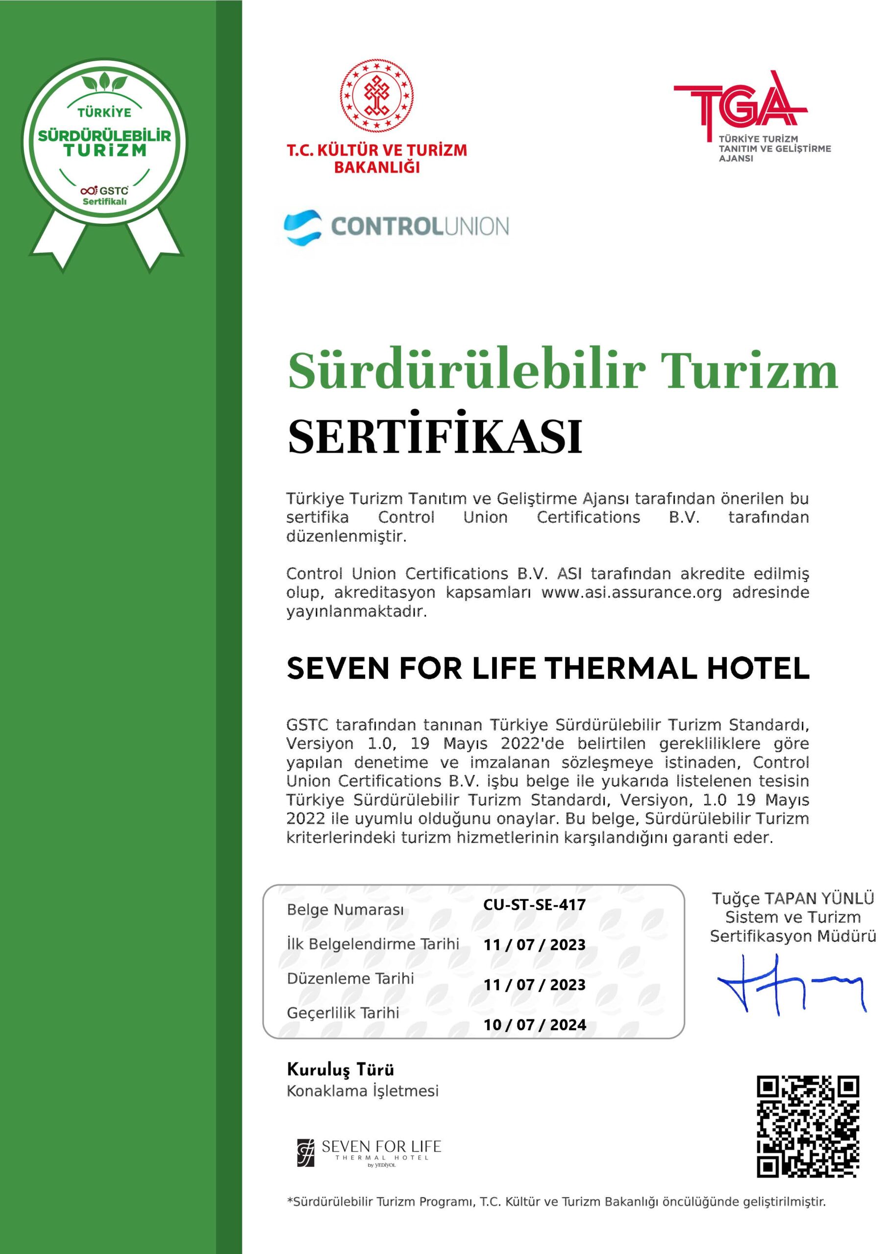 As a result of the audit carried out according to the requirements set out in the Turkish Sustainable Tourism Standard, Version 1.0 May 19, 2022, recognized by the GSTC, and based on the agreement signed, Control Union Certifications B.V. hereby certifies that the facility listed above complies with the Turkish Sustainable Tourism Standard, Version 1.0 May 19, 2022. This document guarantees that the tourism services in the Sustainable Tourism criteria are fully met.